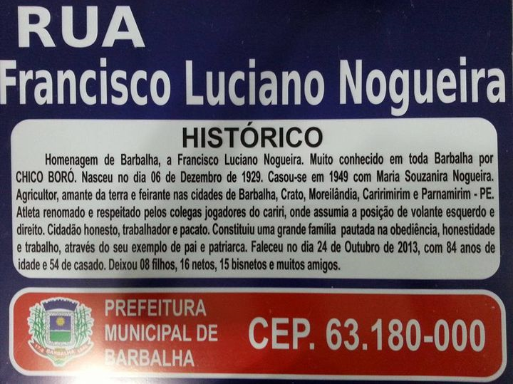 FRANCISCO LUCIANO NOGUEIRA, muito conhecido em toda cidade de Barbalha por “Chico Boró”. Filho de Maria Luciano Nogueira e Vicente da Silva. Residiu na Rua Divino Salvador 116, passou pela Rua Florêncio de Alencar e finalmente na Av. Costa Cavalcante 45. Casou-se em 1949 com a Senhora Maria Souzaninha Nogueira. Agricultor com muito orgulho, amante da terra e feirante nas cidades de Barbalha, Crato, Moreilândia, Caririmirim e Parnamirim Pe.